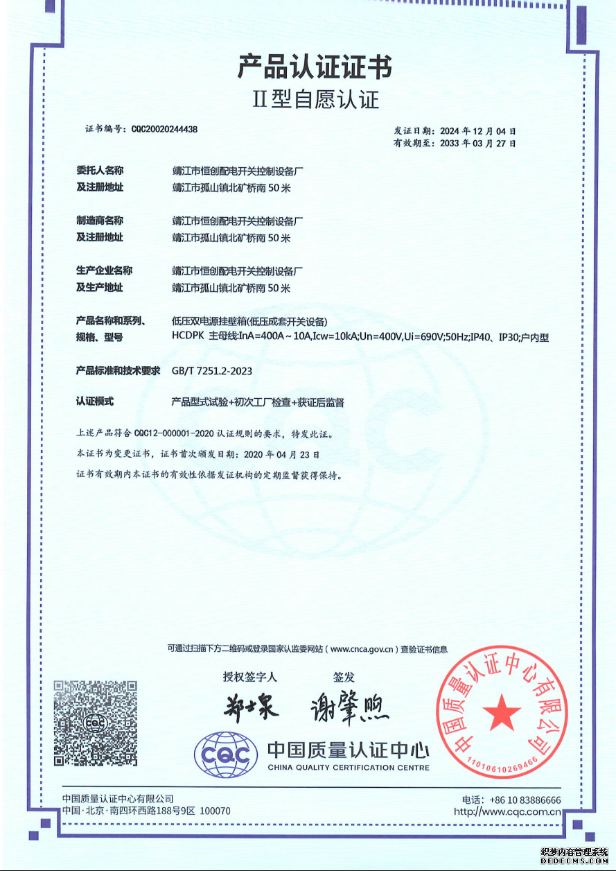 低压双电源挂壁箱-产品认证证书